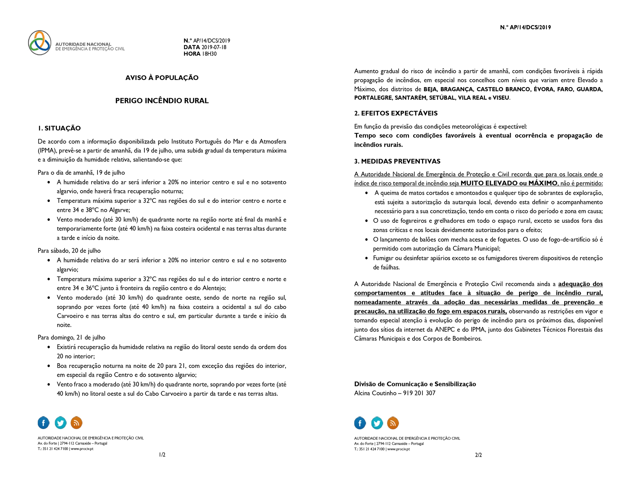 Aviso à População - Perigo de Incêndio Rural