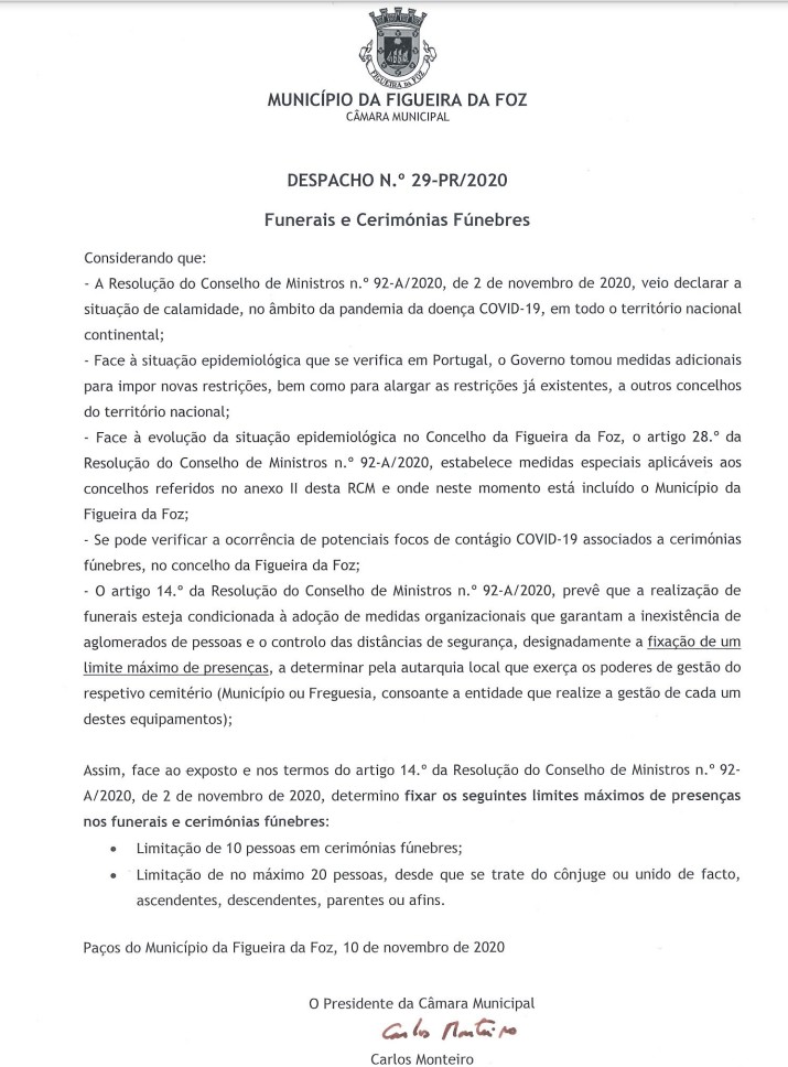 Fixação dos limites máximos de presenças nos Funerais e Cerimónias Fúnebres